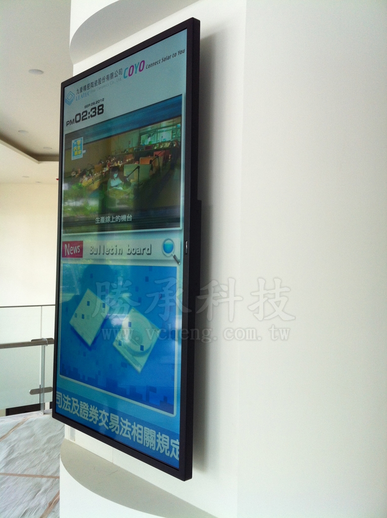 透過北部經銷商導入勝承科技的數位電子看板解決方案,本專案是採用鎧應SMP-WEB4多媒體播放系統和薄型輕巧的勝承55吋LED工業螢幕。