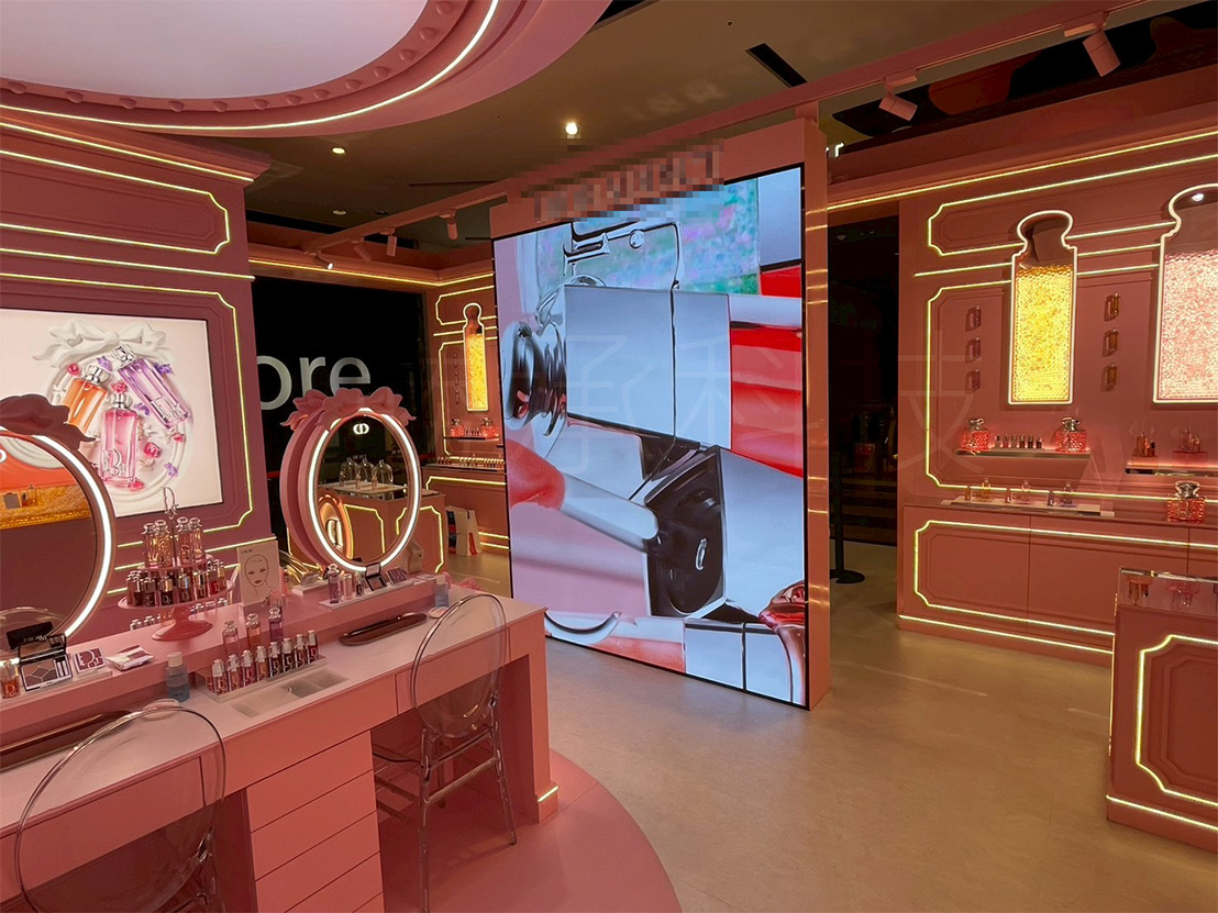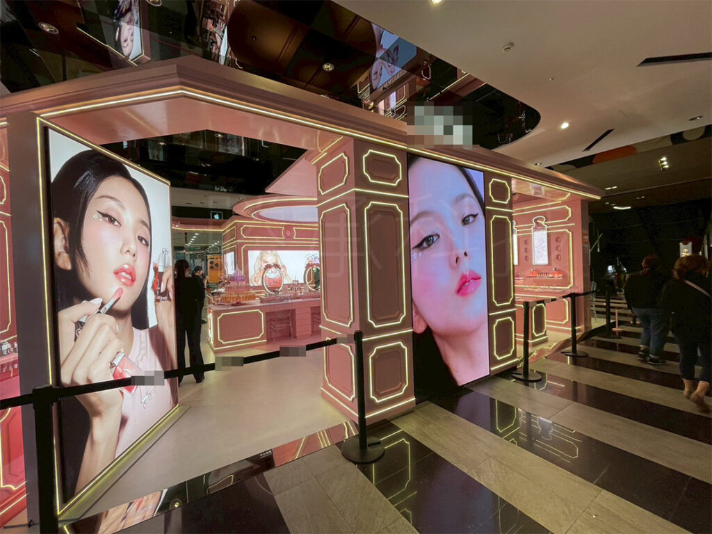 透過設計公司規劃,導入勝承科技GOB LED電視牆系統,採用間距P2.0 LED箱體模組拼接成無邊框顯示牆,主打無接縫、高畫質與高亮度顯示效果。另一座則設置於對外牆面,大畫面輪播快閃主題影像,成功吸引逛街人潮駐足拍照。GOB LED燈板具備防撞、防塵、防潑水等高防護特性,並擁有細緻色彩表現、超高解析度與超廣可視角度,畫面亮度均勻清晰,視覺震撼效果大幅提升品牌展演層次。